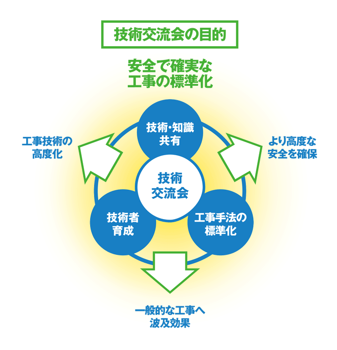 私たち豊国が、鳶職などの職人を集めて行う最大の目的は、安全で確実な工事の標準化を推し進めるためです。具体的には、「技術・知識の共有」「技術者の育成」「工事手法の標準化」を目標としています。これらの目標を元に、技術交流会の個々のカリキュラムが組まれています。